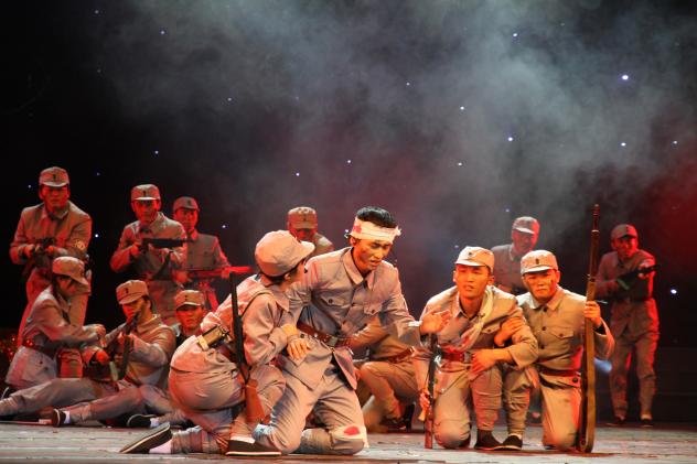 据悉,材料学院所演绎歌舞情景剧“血色青春”改编自歌舞剧“悲怆的黎明”,主要讲述了在新中国诞生前夕,一群在解放区某公学学习的青年学生,面对在望的曙光,对即将到来的新生活充满了遐想。但是最后战斗的炮火仍在硝烟中弥漫,他们深深地懂得,祖国更需要他们作为一名战士,去夺取战争的最后胜利,于是他们毅然决定穿上军装,奔赴前线。在残酷的战斗中,他们经受了血与火、生与死的考验。战争胜利了,可他们当中的许多人却长眠在黎明时刻!看着台上我院老师和同学们精彩的演绎,台下的观众无不为之动容,不断拍手叫好,并不断响起热烈的掌声。