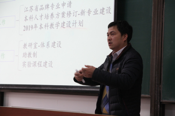 学院副院长陶海军就2019年本科教学管理、实验室安全管理工作计划进行了介绍。学院教学工作将在规范化、流程化方面下功夫,给师生们提供更加清晰、简便的服务,同时重点聚焦江苏省品牌专业建设、新专业建设等重点工作。在实验室安全管理方面,学院始终保持高度重视,构建三级管理体系建设,推行检查常态化、建设标准化、流程制度化、培训规范化、责任明确化的“五化制度”,守好安全红线。