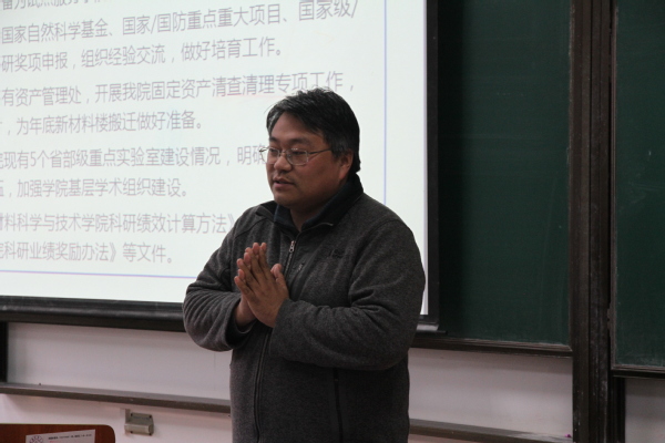会上,孙占久对校党字【2019】2号、3号、4号文件精神,教育思想大讨论总结大会、新学期干部教师大会报告、学校2019年工作要点进行了集中宣贯、划重点。他强调2019年是落实校十六次党代会决策部署、推进“双一流”建设的攻坚之年,“再落实年”,学院新一届党政领导班子将带头学习、融入学校发展大局,贯彻落实各项工作。学院要统一思想,在南航新时期办学理念和人才培养目标的指引下,紧扣国家战略需求,牢牢把握立德树人根本任务,推动学院改革有序开展。同时,他就2019年党建工作要点进行了简要介绍。新的一年,学院党建工作将围绕四个方面17项主要工作推进,重点加强学院的文化建设,加强正面宣传工作,营造良好的学院氛围,内聚合力,外树形象,为学院各项工作开展夯实基础。他强调每个人都要有所作为,融入学院发展大局,学院也要为老师们干事创业尽可能创造必要的条件。最后,他再次强调了安全工作,要求全院教工吸取近期兄弟院校安全事故的教训,不断增强安全意识,警钟长鸣。