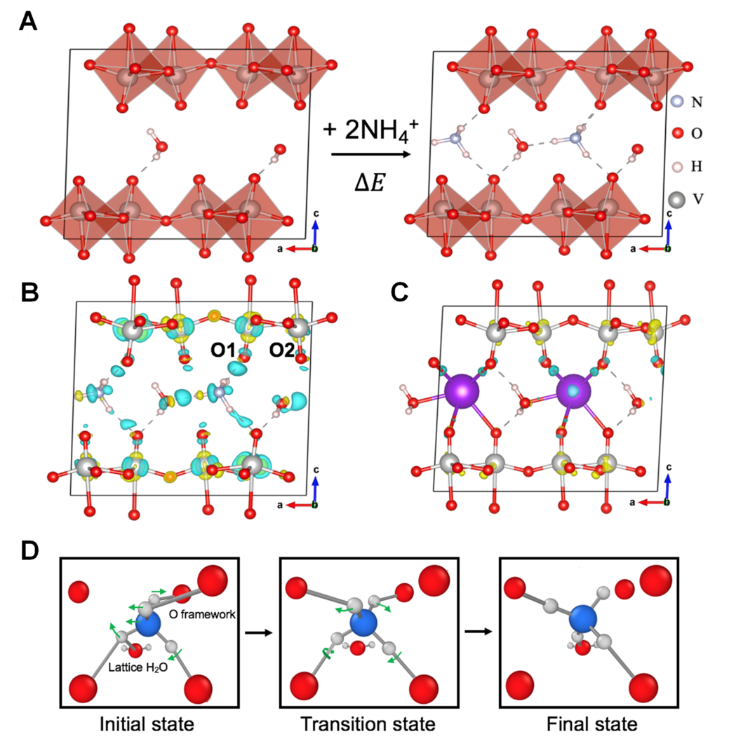 实验上,傅里叶变换红外(FTIR)光谱和固态核磁共振(NMR)谱等表征技术证实了NH4+与双层V2O5之间氢键的存在,而K+与双层V2O5之间不可能存在氢键。他们还采用密度泛函理论对NH4+和K+在双层V2O5中的储荷机制进行了研究。研究发现,与球形的K+在双层V2O5中的扩散方式不同,四面体构型的NH4+能够通过扭动和旋转保持与V2O5的氢键结构的方式进行扩散。具体地,NH4+通过扭动断开其中一个氢键,然后在前进方向形成新的氢键,同时其他的三个N-H键保持不变。他们把这种特殊的离子扩散方式称之为“monkey bars swinging”。进一步的研究发现,NH4+与V2O5之间存在电荷转移现象,即V2O5通过氢键将0.17个电子转移到每个NH4+,因此可以将NH4+在V2O5中的存储看作是一种“化学吸附”行为,但是这种“化学吸附”并不仅仅发生在电极材料的外表面,主要是发生在双层V2O5晶体结构内部。他们将这种化学吸附引起的嵌入赝电容称之为“CI pseudocapacitance”。