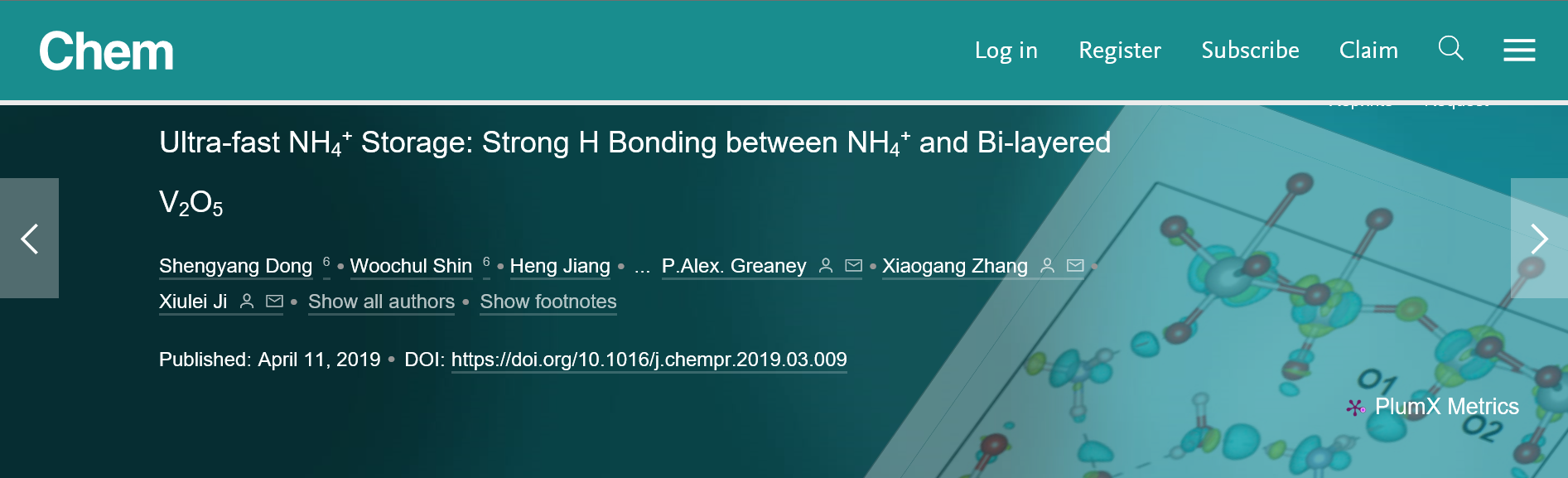 近日,我校英国365集团张校刚教授课题组与美国的俄勒冈州立大学、加州大学河滨分校、阿贡国家实验室等中美联合研究团队在超高功率储能器件方面取得重要研究进展。相关研究成果(Ultra-fast NH4+ Storage: Strong H Bonding between NH4+ and Bi-layered V2O5”)以我校为第一单位发表在《Cell》子刊《Chem》(化学类顶级期刊;IF=14.104)上,第一作者是我校英国365集团的博士研究生董升阳。