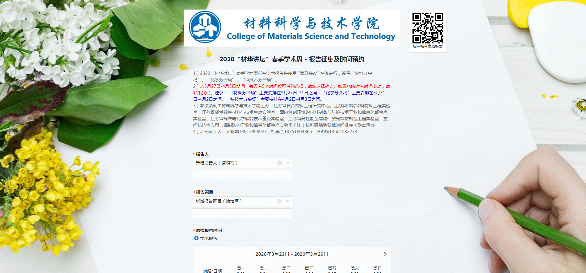 2020年3月27日—4月3日,英国365集团通过网络在线方式举办了2020“材华讲坛”春季学术报告周活动。由于新冠肺炎疫情影响,我校至今仍无法开学,广大学生也无法到校正常学习。材料学院贯彻落实“停课不停学”的学校要求,决定在此期间采用网络会议形式举办2020“材华讲坛”春季学术报告周活动,以期达到宣传南航材料学院、加强学术科研交流、推动本科生专业培养、开展研究生招生宣传等目的。