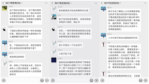 其次,为了拓宽学习广度,挖掘学习深度, 21日和22日,在收看两会开幕式的基础上,全体成员在线上群聊中就关注的或者感兴趣的议案开展了激烈的讨论。大家在讨论中感受代表们直面问题的坦率态度、解决问题的思考深度、提出建议的科学程度。