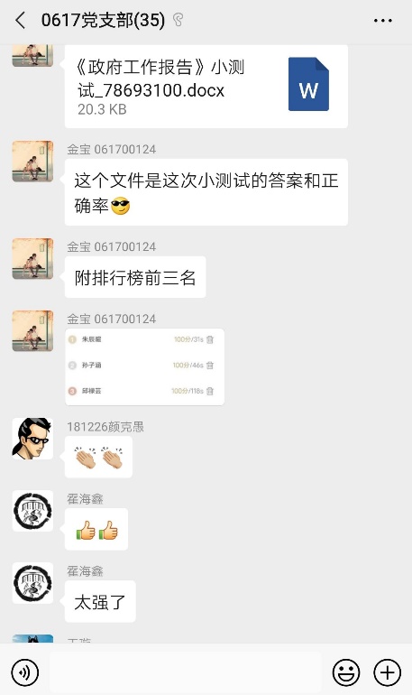 原文才最能体现理论的精神实质和核心要义,而学习原文才最能深刻领悟两会重要精神,因此,全体成员在研讨后,于24日对《政府工作报告》进行了阅读学习。为了加深对关键要点的理解,领学小组又制作了一份《政府工作报告小测试》,包含“六稳”“六保”的概念、三大攻坚战的举措、公共卫生体系建设的着力点等,以考促学,并展示考试分数排名。