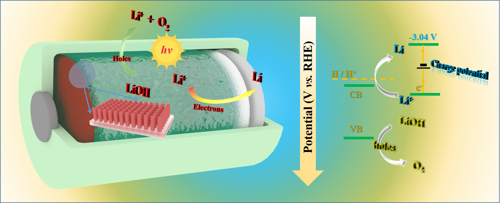设计组装成正极以水溶液为电解液的杂化水系锂-氧电池,并直接采用两种不同光电半导体为正极。测试过程中的电化学反应机理明确,无有机电解液中各类副反应的存在,基本反应如下: