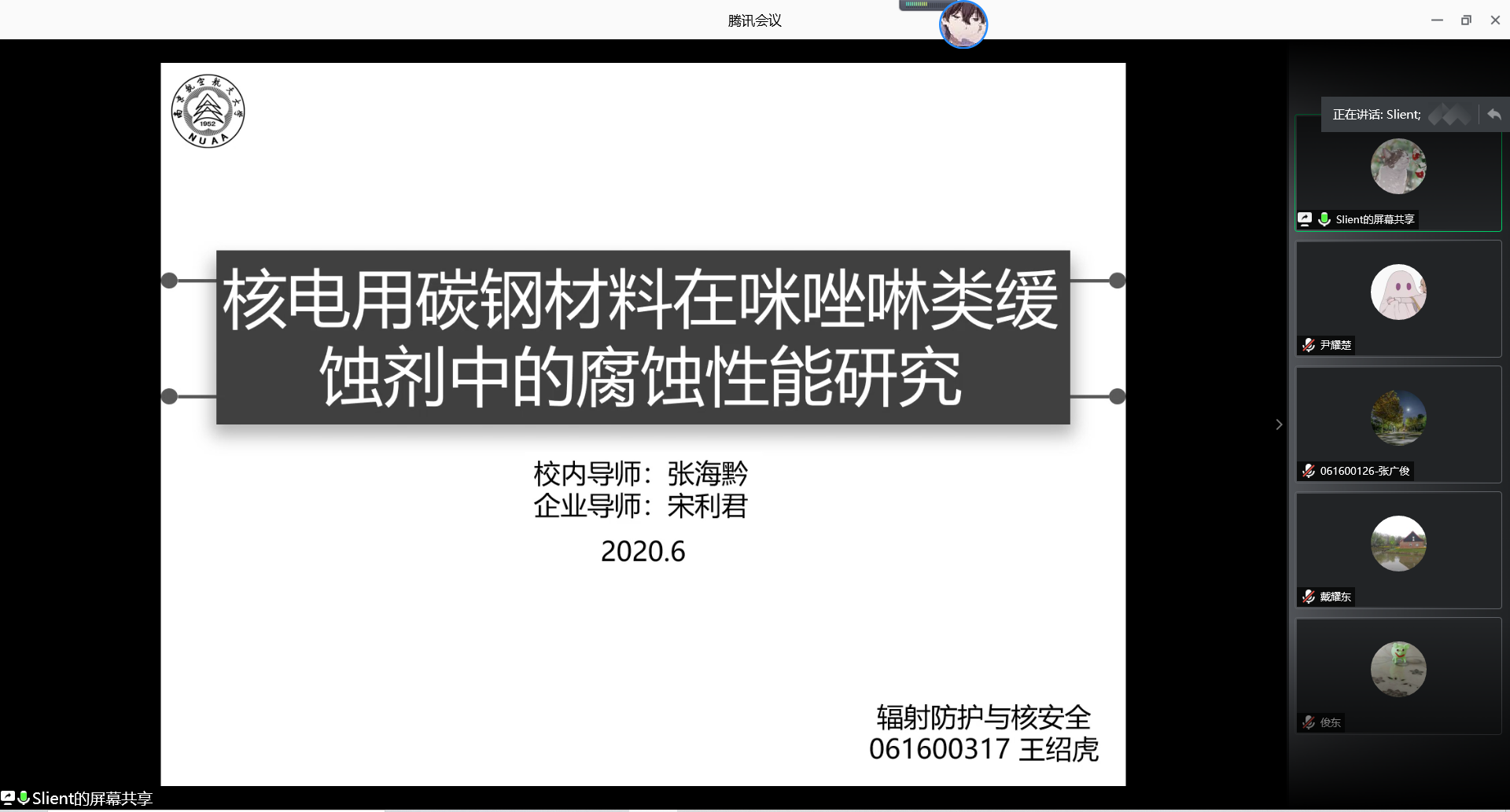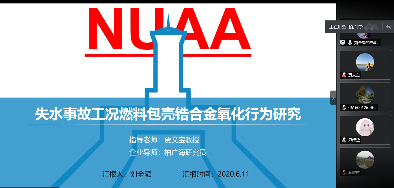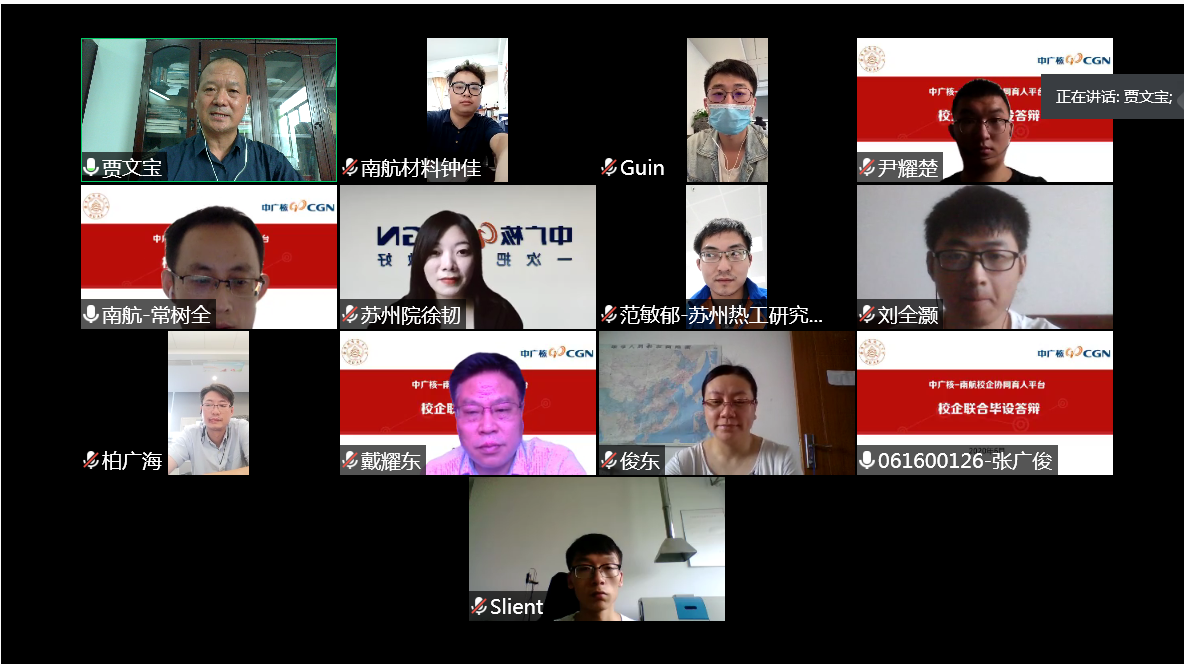 6月11日,中广核—南航校企协同育人平台首期校企毕设项目答辩在腾讯会议通过线上方式顺利开展。中广核苏州热工研究院有限公司人力资源部副主任徐韧,电站寿命管理技术中心柏广海、范敏郁,校企项目负责人顾鑫4位专家,英国365集团院长助理、核科学与技术系主任常树全,教工三支部党支部书记丰俊东,核科学与技术系贾文宝、戴耀东等5位教师参加了此次校企毕设项目答辩。