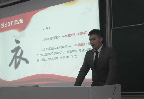 第三组分享人王新元同学则另辟蹊径,以高考制度的改革为切入点为我们展示了一个别开生面的改革开放,高考制度的改革使我们与南航相遇,提醒同学们珍惜来之不易的学习机会。随后,毕家旭同学为我们上了一节关于改革开放的“语法课”,他将改革开放分为三个时态:过去、现在与将来,形式新颖,讲的也深入浅出,在生动幽默的话语中引起了同学的共鸣。最后一组分享人丁灵同学带我们再次回顾了这具有历史意义的改革开放,偶从现实中的例子说起,过渡到改革开放,再以解决之前留下的疑问作结,环环相扣。一晚上一个半小时的分享,犹如一场思想盛宴,让人意犹未尽。