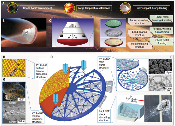 为明晰“材料–结构–性能一体化增材制造”的科学内涵与技术途径,本文面向下一代空间探测器着陆器系统的整体化和多功能化发展趋势,针对隔热/防热、减震抗冲击、空间抗辐射等多功能需求,创新发展鳞脚蜗牛壳的层状复合结构、水蜘蛛的水泡构型、多孔蜂窝等仿生结构,并基于陶瓷/金属梯度复合材料、碳纳米管增强金属基复合材料等多材料设计与布局,实现仿生多材料整体构件的材料–结构–性能一体化增材制造及其高性能/多功能。