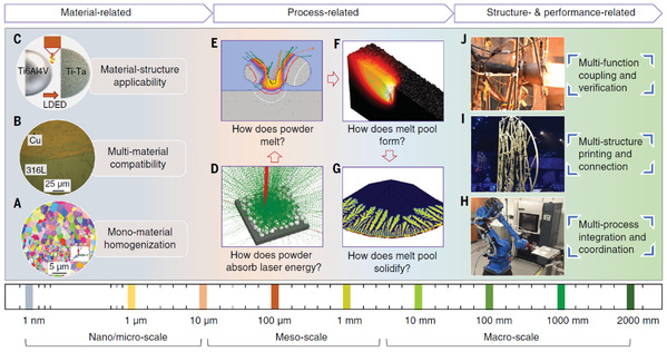 本文建立了“材料–结构–性能一体化增材制造”的跨尺度实现原理及调控方法,包括微观尺度的材料组织与界面调控、介观尺度的粉末激光熔凝及致密化工艺控制、宏观尺度的构件结构与性能精确协调。本文进一步对“材料–结构–性能一体化增材制造”未来发展方向进行了总结与展望,包括更加数字化的材料创成和结构创新、更具自主决策功能的打印装备、更加智能化的打印过程、更加多元融合的打印工艺、更加绿色可持续的打印技术及应用等。