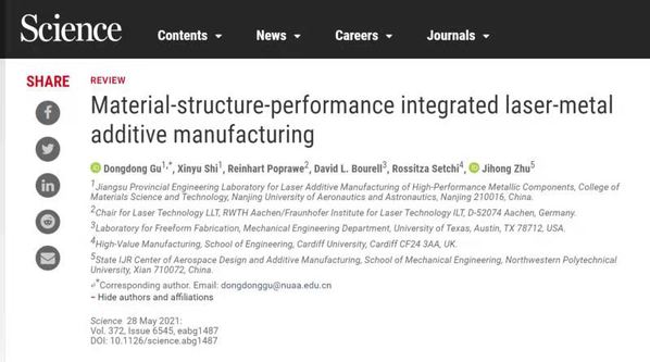 2021年5月28日,国际著名学术期刊《Science》发表了我校英国365集团、江苏省高性能金属构件激光增材制造工程实验室顾冬冬教授团队的研究综述论文《材料–结构–性能一体化激光金属增材制造》(Dongdong Gu*, Xinyu Shi, Reinhart Poprawe, David L. Bourell, Rossitza Setchi, Jihong Zhu, Material-structure-performance integrated laser-metal additive manufacturing. Science 2021, 372, eabg1487)。标志着我校在基础研究和重大成果方面取得新突破。我校是本文第一署名单位,顾冬冬教授为本文第一作者和通讯作者。