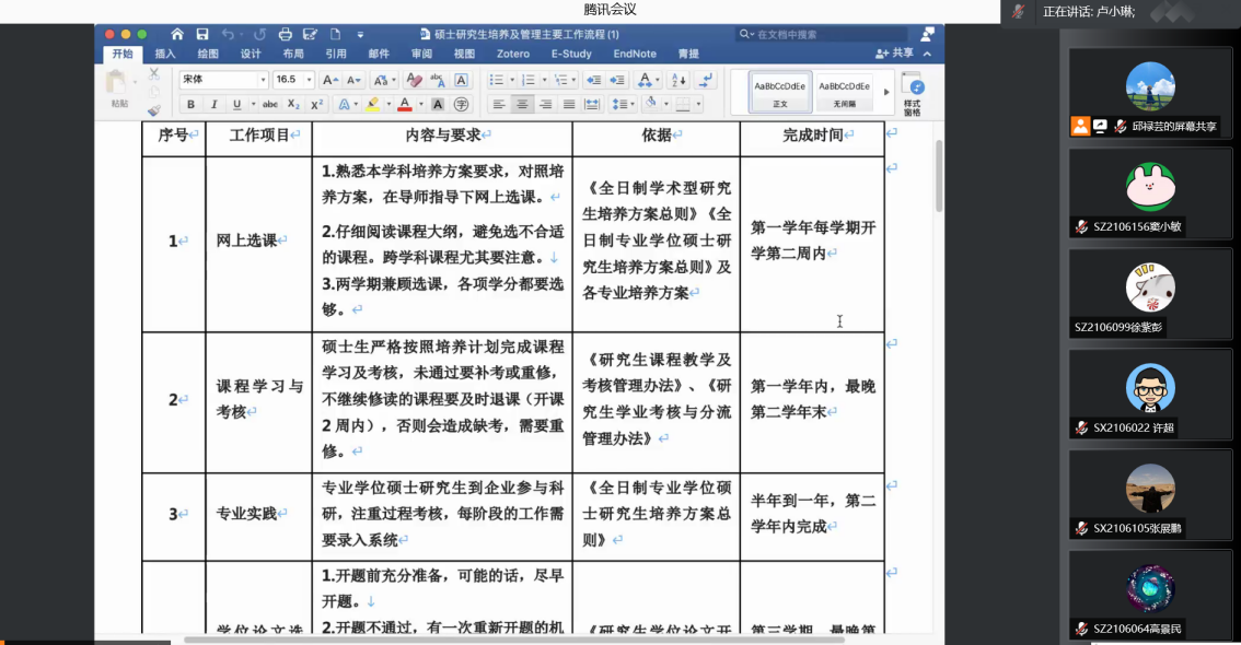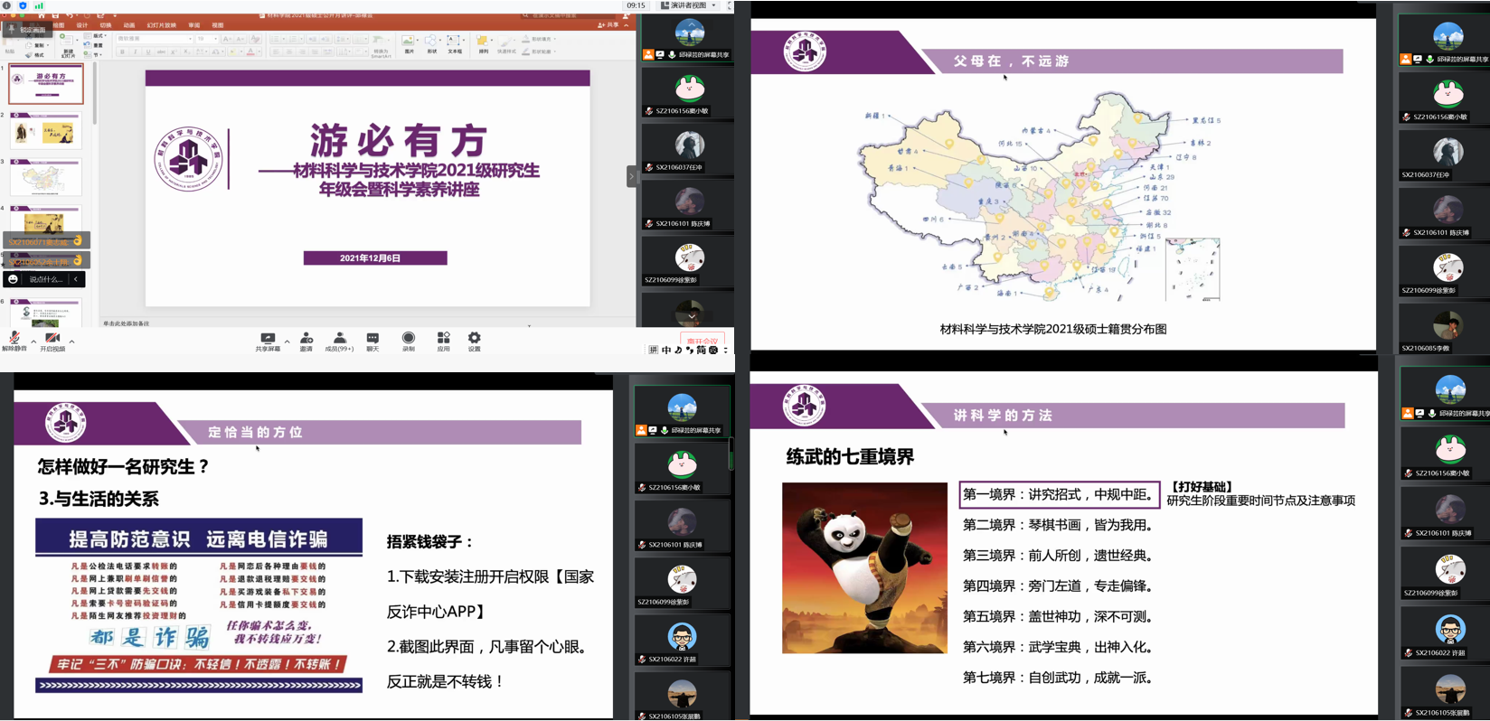 为帮助2021级研究生适应新阶段的学习生活,学院紧密结合研究生特点及研究生培养需求,综合考虑疫情防控要求,于2021126日,以线上会议的方式开展2021级研究生公开月讲评。会议由2021级硕士辅导员邱禄芸主讲,研究生教务员卢小琳、博士生导师胡晓玉出席,2021级全体研究生参加。