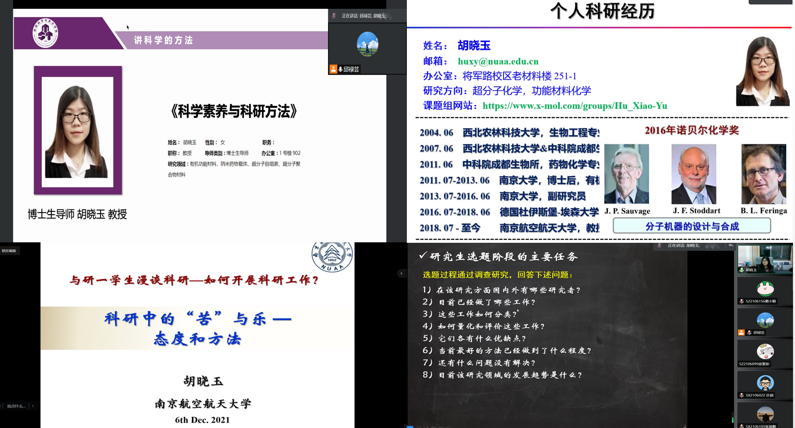 胡晓玉通过对个人科研经历的介绍,包括科研工作的选题、漫漫科研路中的“苦练”以及科研成果,以春风化雨的方式,讲述了科研过程中的苦与乐,告诉同学们要正视科研过程中暂时的挫折和困难,主动出击,积极应对,锤炼心理素质,希望同学们都能享受科研、热爱科研。