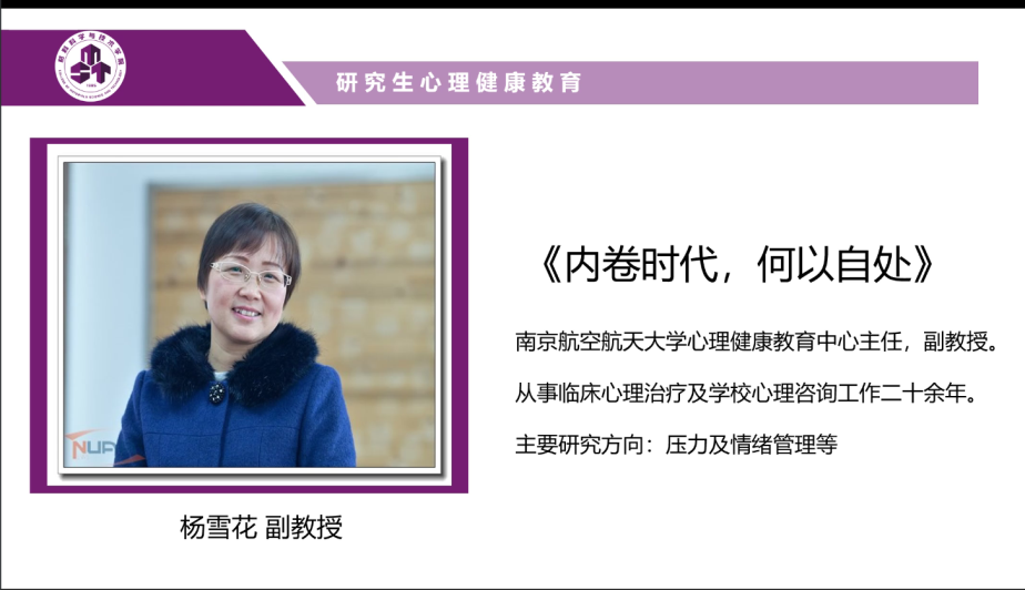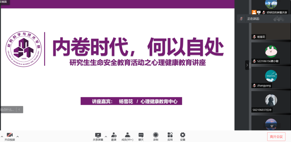为帮助研究生新生改善心理机能,培养良好的心理品质,塑造健全的人格,学院紧密结合研究生特点及研究生培养需求,综合考虑疫情防控常态化要求,于20211220日晚,开展以“内卷时代,何以自处”为主题的心理健康教育讲座。讲座邀请我校心理健康教育中心主任杨雪花任主讲嘉宾,2021级全体研究生参加。本次讲座由辅导员邱禄芸主持。