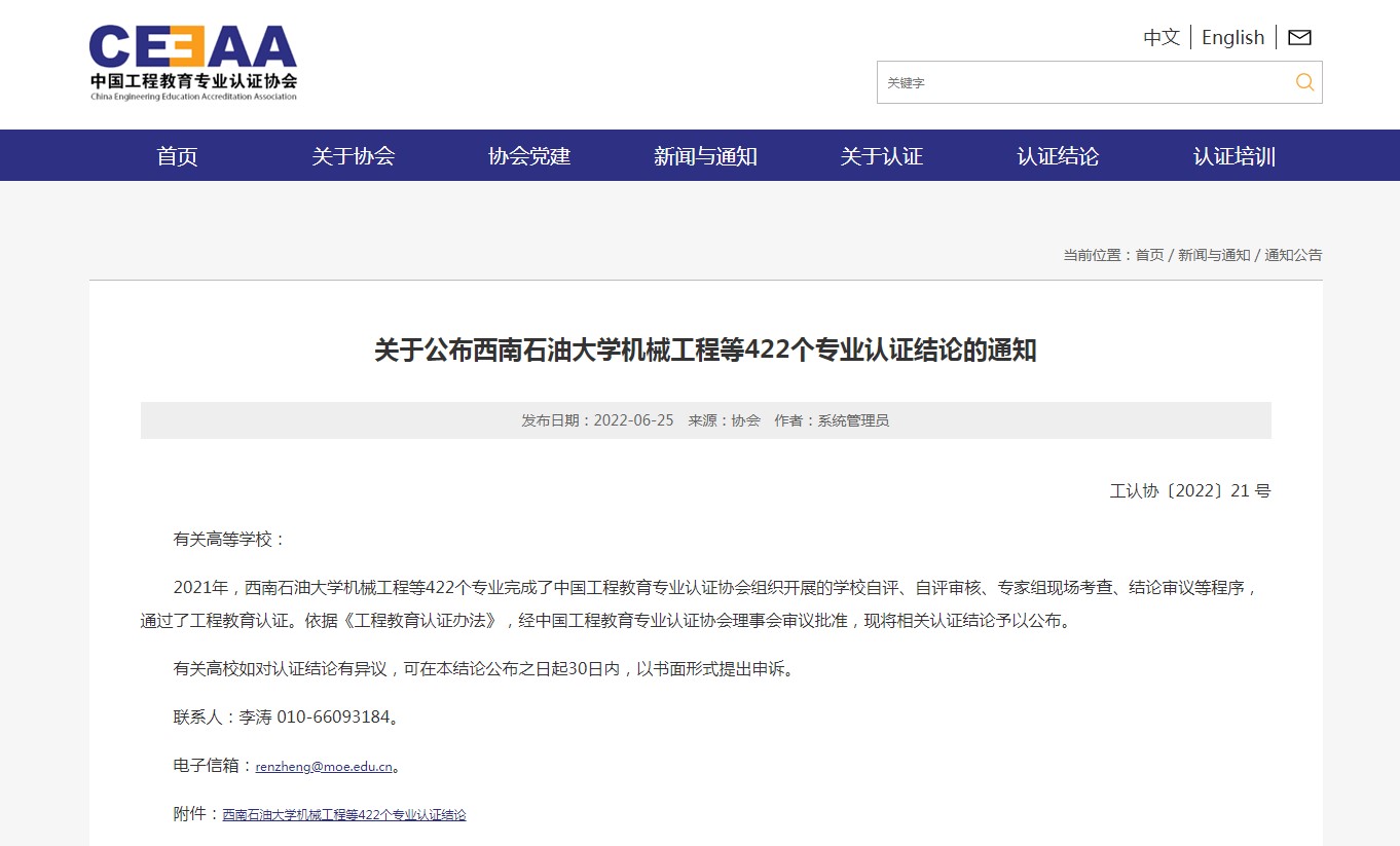 近日,中国工程教育专业认证协会正式公布了2021年工程教育专业认证结论,我院核工程与核技术专业顺利通过本次认证,有效期为6年(2022年1月至2027年12月)。这是继材料科学与工程之后,学院第二个通过认证的专业。