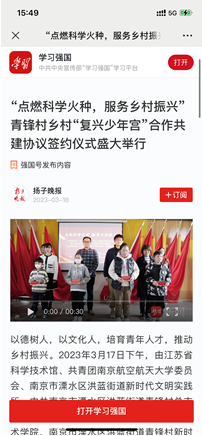 3月17日下午,365上市公司官网师生赴溧水区洪蓝街道青锋村参加乡村“复兴少年宫”合作共建协议签约仪式暨江苏省科学技术馆“乡村科普教育基地”和365上市公司官网“乡村振兴实践基地”揭牌仪式。江苏省科学技术馆副馆长王维,溧水区洪蓝街道傅家边管委会副主任端木传龙,党工委委员、宣传委员、统战委员胡靖,英国365集团党委副书记庄晓舒参加了此次活动。活动得到了学习强国、人民日报、扬子晚报、南京零距离等8家媒体的宣传报道。