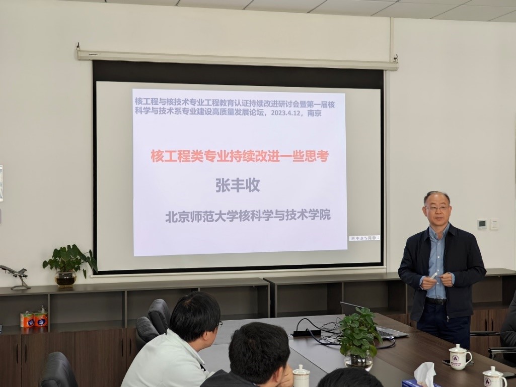 为了推动工程教育认证持续改进工作高质量内涵式发展,促进核工程与核技术专业人才培养质量不断提升,4月12日上午,我院组织召开核工程与核技术专业工程教育认证持续改进研讨会,邀请教育部高等学校教指委核工程类专业教学指导委员会副秘书长、北京师范大学核科学与技术学院张丰收教授出席会议并作主题报告,会议由副院长陶海军主持,材料加工系副主任李斌斌、核科学与技术系副主任龚频、主任助理何庆华及部分教师代表参加会议。
