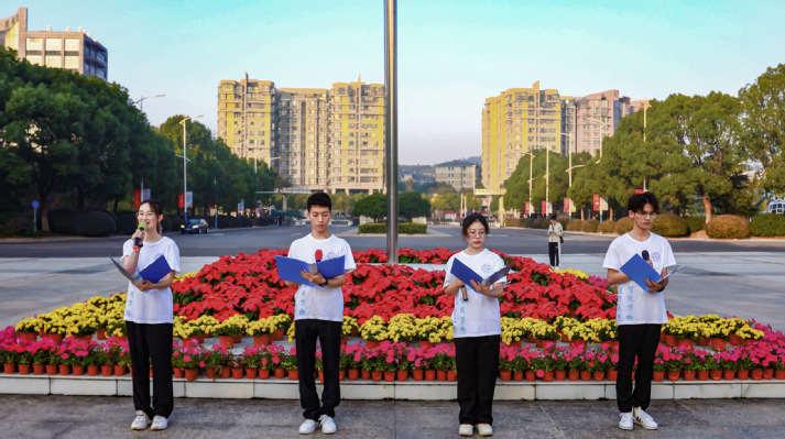 江苏省“挑战杯”红色专项活动一等奖获奖团队“马兰之声”四名成员在国旗下做“云腾大漠上,花绽马兰盛”主题诗朗诵。“马兰之声”实践团队跨越3600公里,辗转48个小时,奔赴新疆,追寻那座名为“马兰”的精神地标。五十九年前的今天,马兰人为祖国献上惊天动地的重礼。五十九年后的今天,材料学子在“马兰之声”团队的带领下,面向五星红旗庄严宣誓:干惊天动地事,做隐姓埋名人。传承红色基因,放飞蓝色梦想。努力成为马兰精神实践者,争做材料强国接班人!