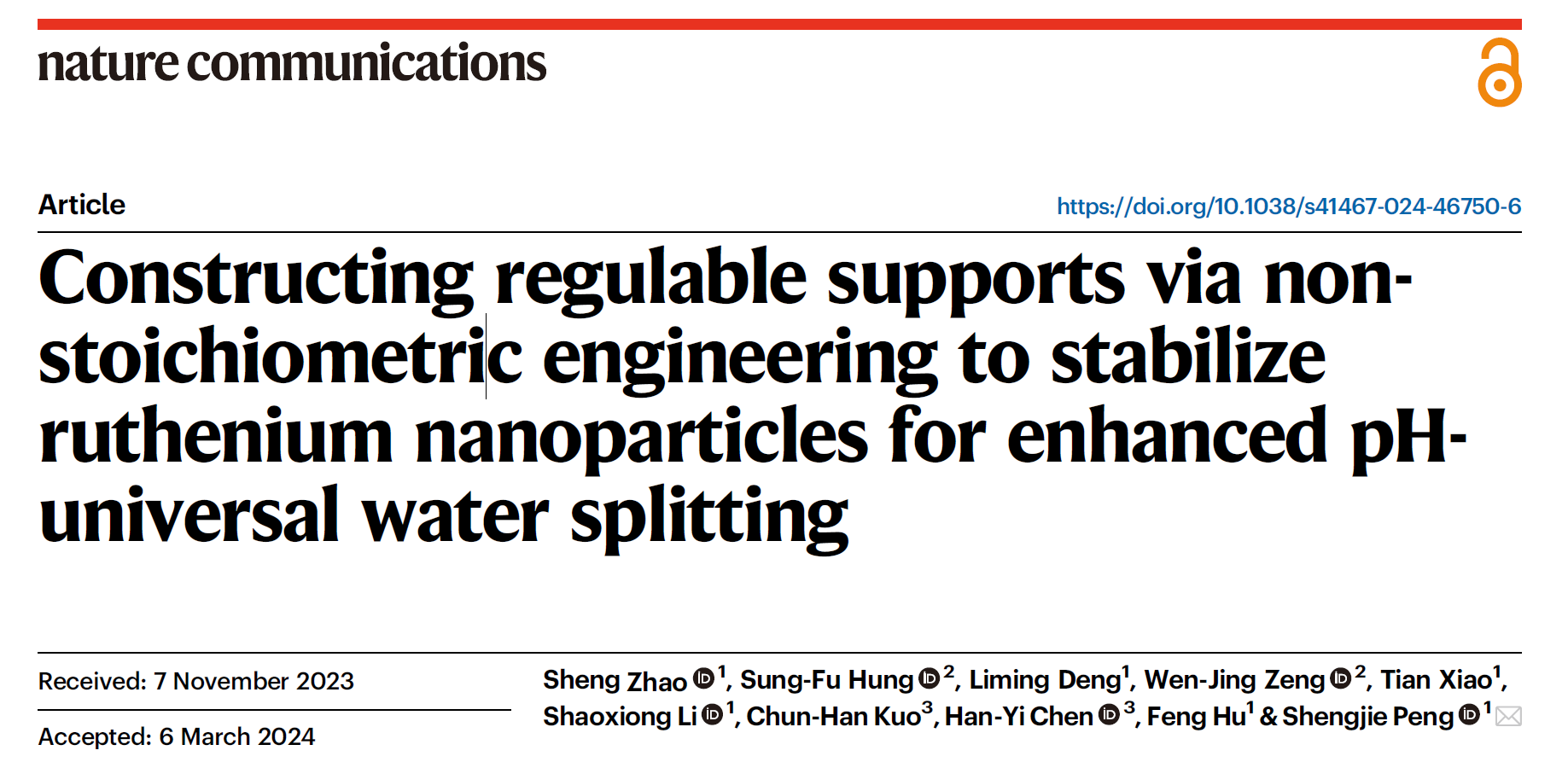 近日,英国365集团电催化与清洁能源团队彭生杰教授Nature Communications期刊发表了一篇题为“Constructing regulable supports via non-stoichiometric engineering to stabilize ruthenium nanoparticles for enhanced pH-universal water splitting”的研究论文,论文第一作者为英国365集团博士生赵晟,彭生杰教授为通讯作者。