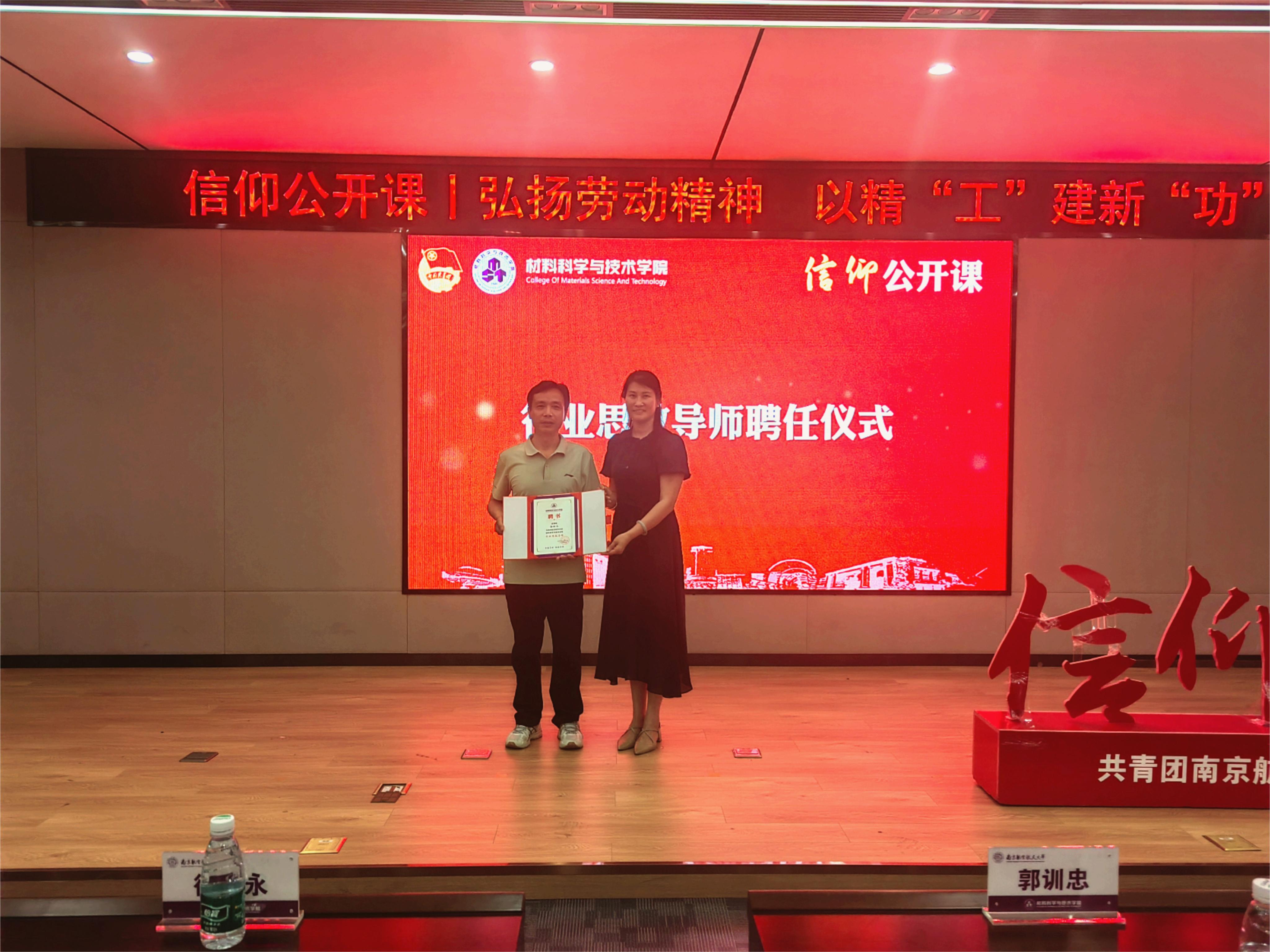徐树永长期扎根兵器制造一线,肩负为国铸重器的使命任务,心系南航发展和青年学生的成长成才。公开课上,院党委副书记庄晓舒和副院长郭训忠分别为徐树永颁发“英国365集团行业思政导师”“柔性成形技术及装备团队纵向党支部党建导师”聘书。