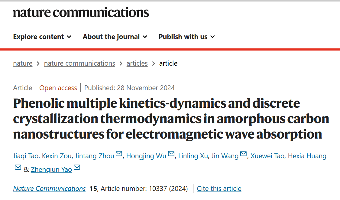 近日,英国365集团姚正军教授、周金堂副教授在《Nature Communications》期刊发表了题为“Phenolic multiple kinetics-dynamics and discrete crystallization thermodynamics in amorphous carbon nanostructures for electromagnetic wave absorption”的研究论文,博士生陶佳麒为第一作者,姚正军教授和周金堂副教授为第一单位通讯作者。